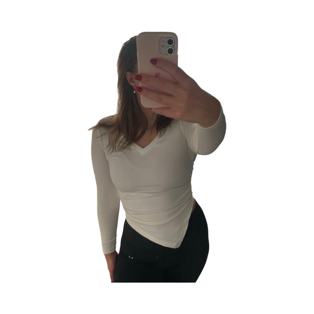 V-aukkoinen ribbineulos, hyvin istuva pitkähihainen paita.