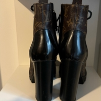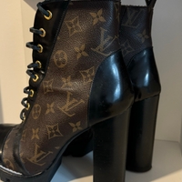 High-heeled monogram lace-up ankle boots, chunky sole.