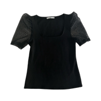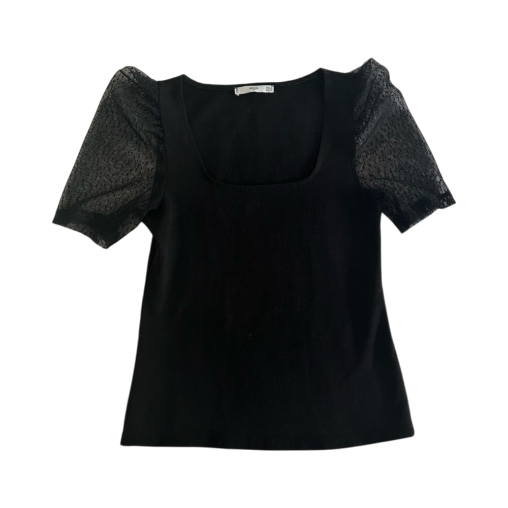Mustapintainen toppi läpikuultavilla verkkohihansuilla.