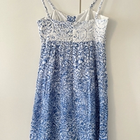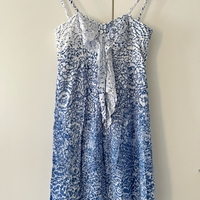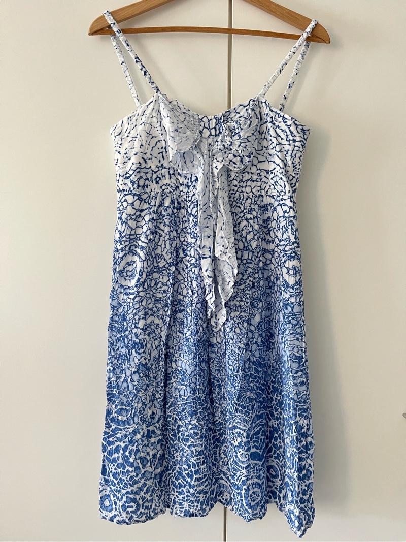 Sinivalkoinen kesämekko rusetilla koossa 38. Takana piilovetoketju ja kuminauhalliset olkaimet. Siistissä kunnossa