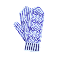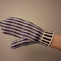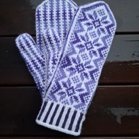 Uuder lila-valkoiset kirjoneulelapaset. Kokonaispituus noin 25 cm, leveys noin 9 cm, kuvattu hanskakoon 7,5 kädessä.