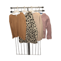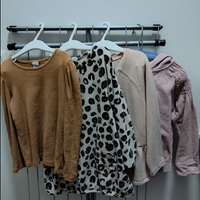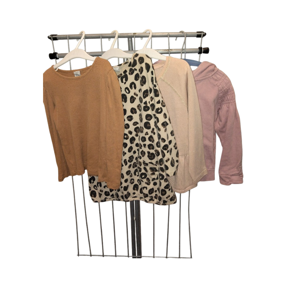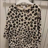 Four items: Lindex ribbed shirt brown, size 116,very good condition. Lindex leopard tunic, size 116, good condition. Lindex peplum cardigan, 110/116, OK condition (a bit worn and there is a tiny blue stain in front). Name it hoodie, good condition.