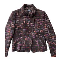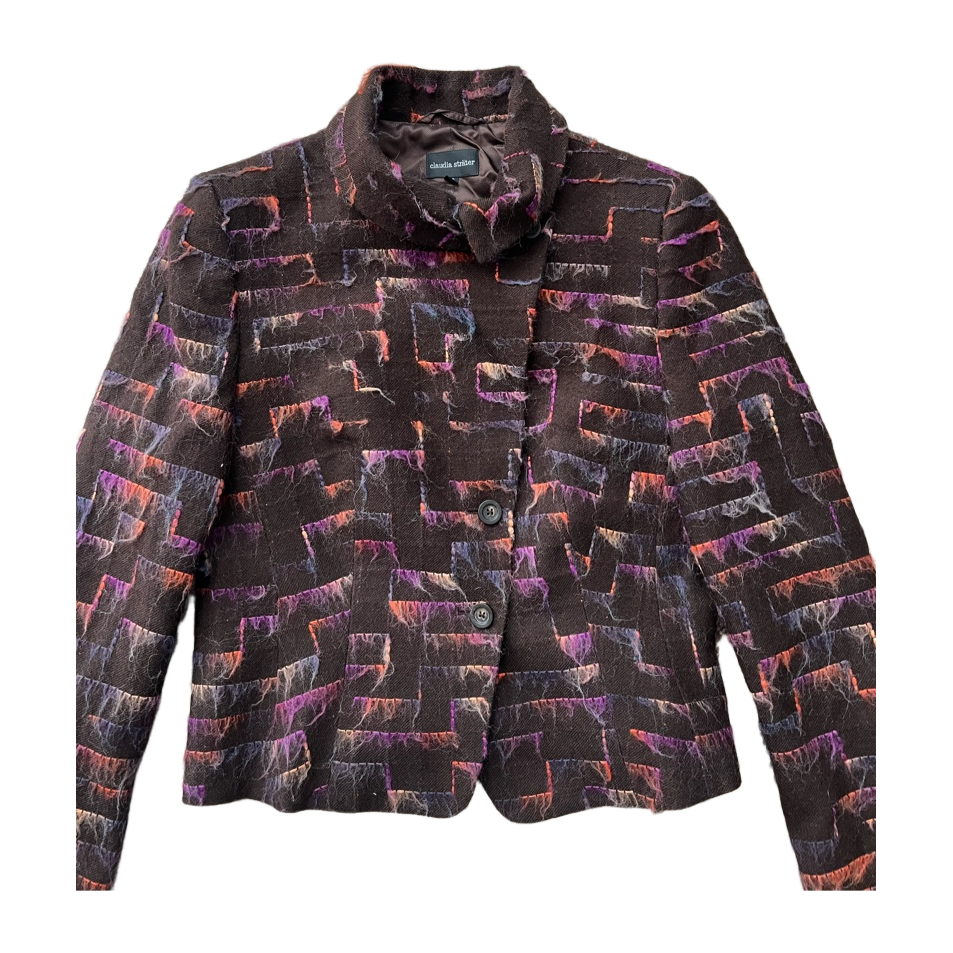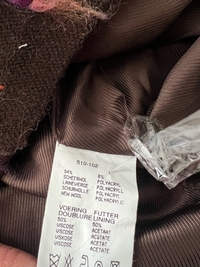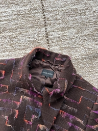 Ruskea villasekoite bleiseri violetilla ja oranssilla kuviolla