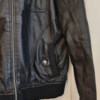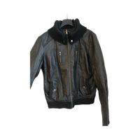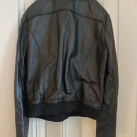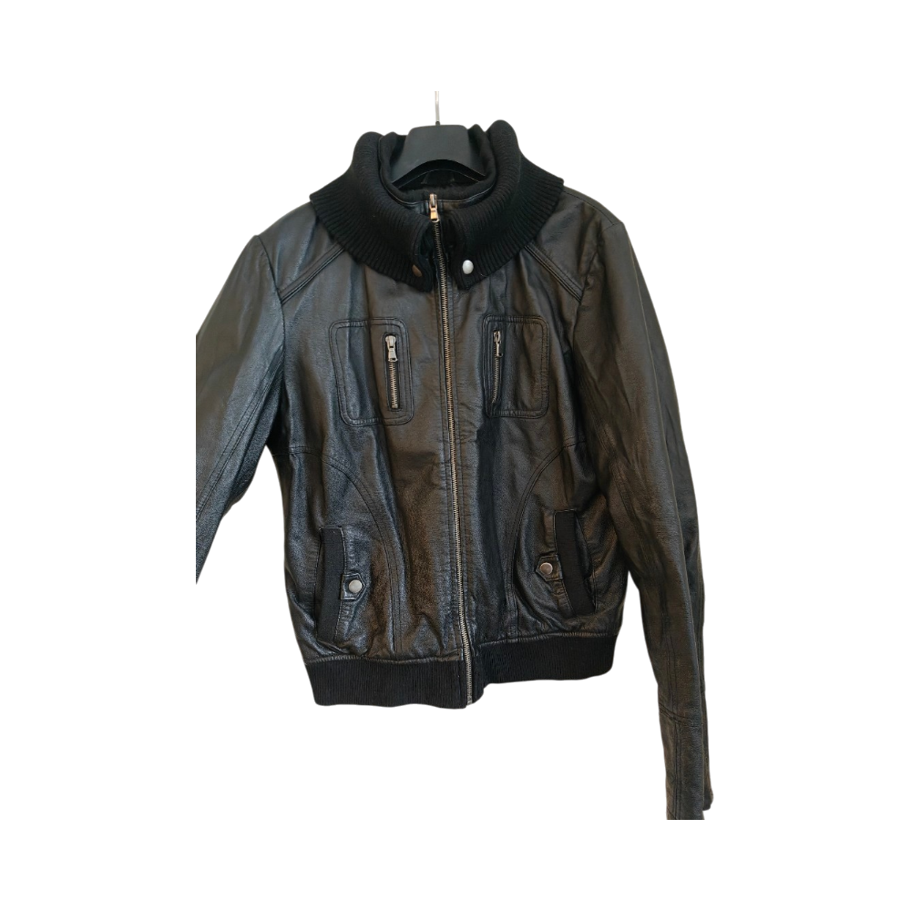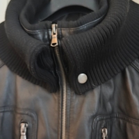 Lyhyt musta naisten tekonahkatakki, neulekaulus ja vetoketjut.