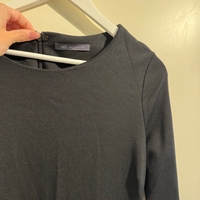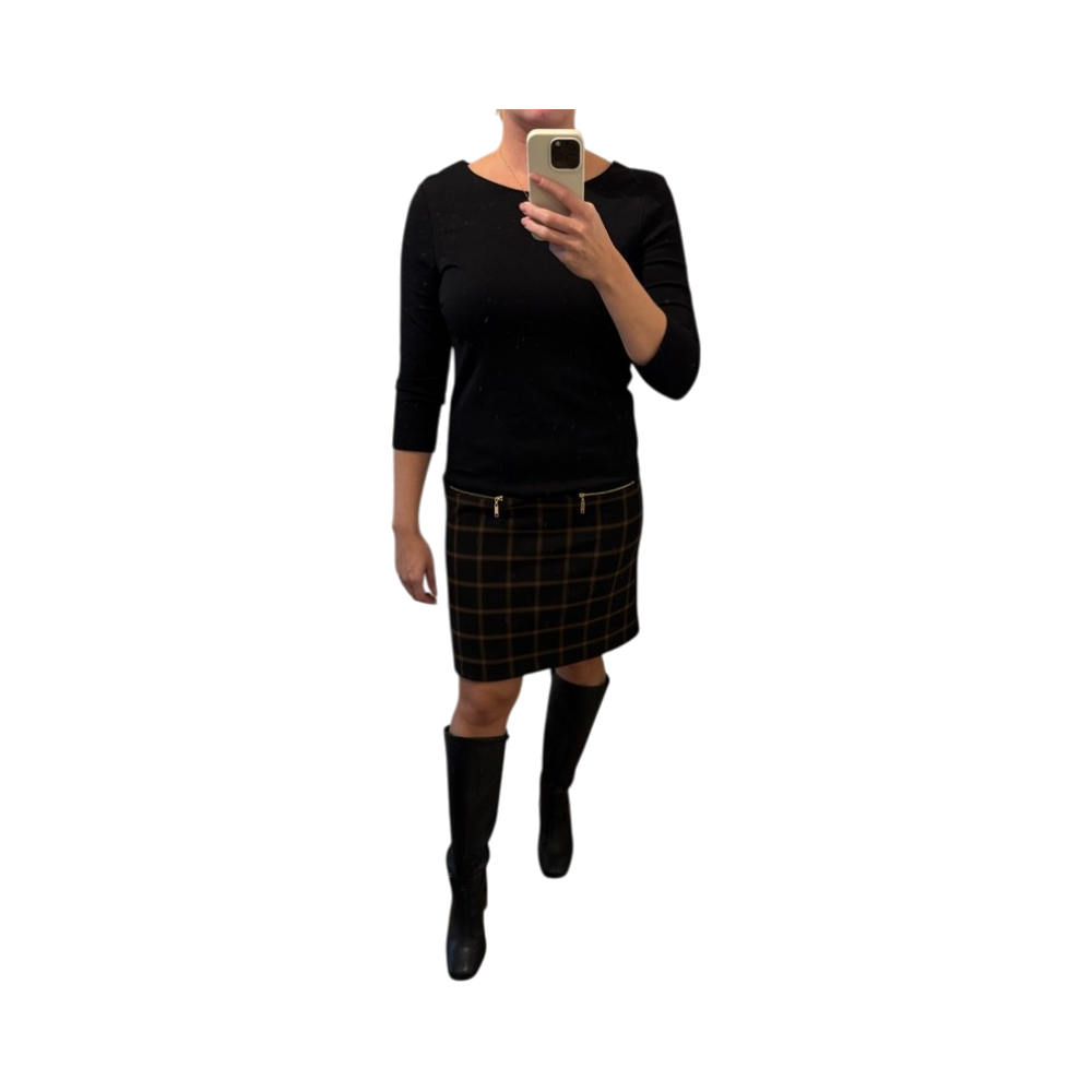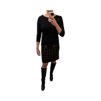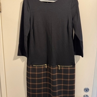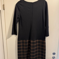 Polvipituinen mekko, 3/4-hihat, ruutukuvio helmassa.