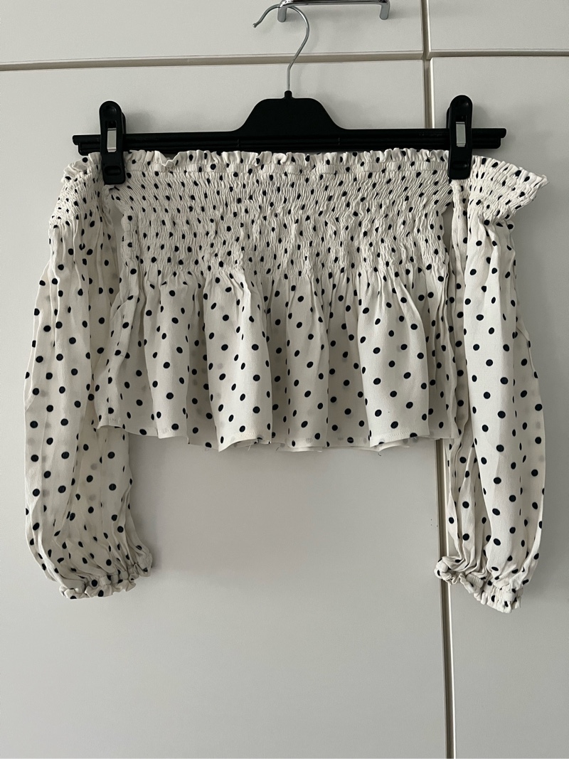 Valkoinen pilkullinen off-shoulder toppi koossa S. Joustava mutta sanoisin että menee parhaiten XXS-S kokoiselle. Hihat ovat irralliset niin käsiä pystyy liikuttamaan ongelmitta. Kunnossa ei moitteita