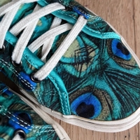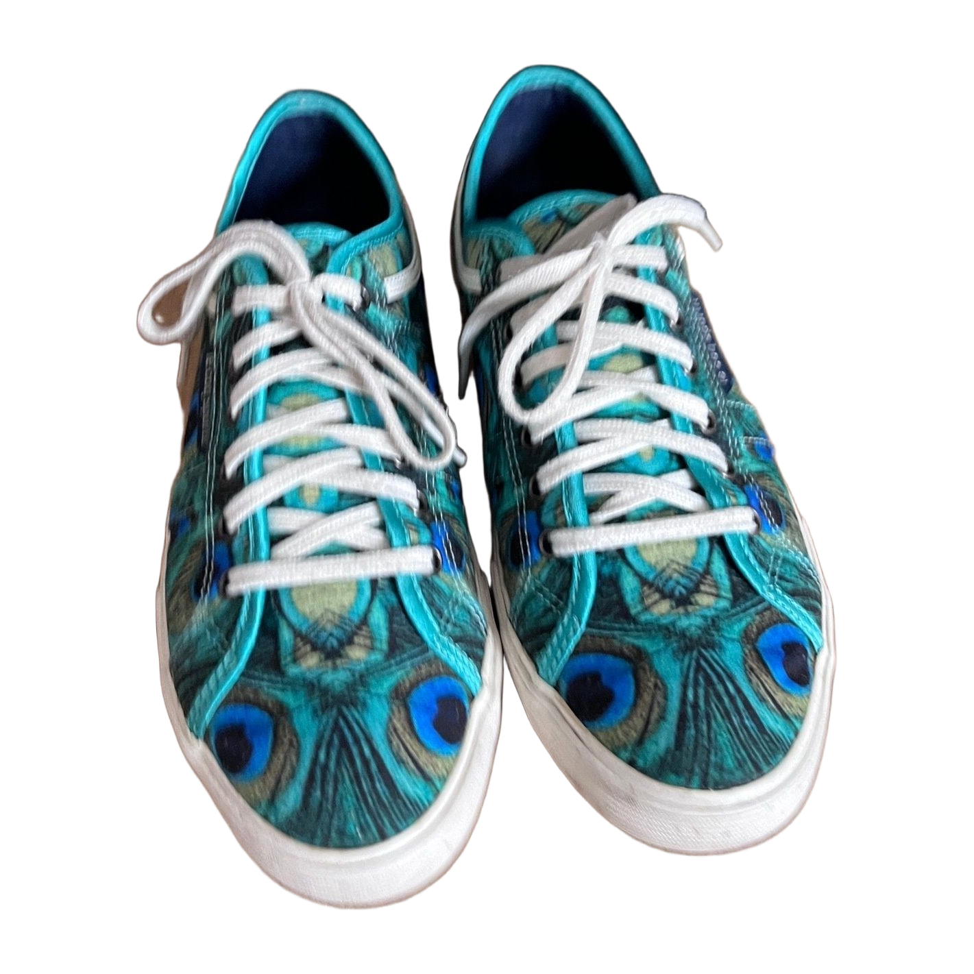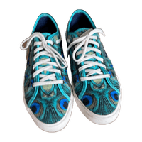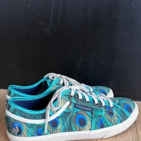Valloittavat riikinkukkotennarit! Jämäkkää vihertävää kangasta satiinireunuksin. Hieman likaa valkoisissa kumiosissa, muuten priimat.