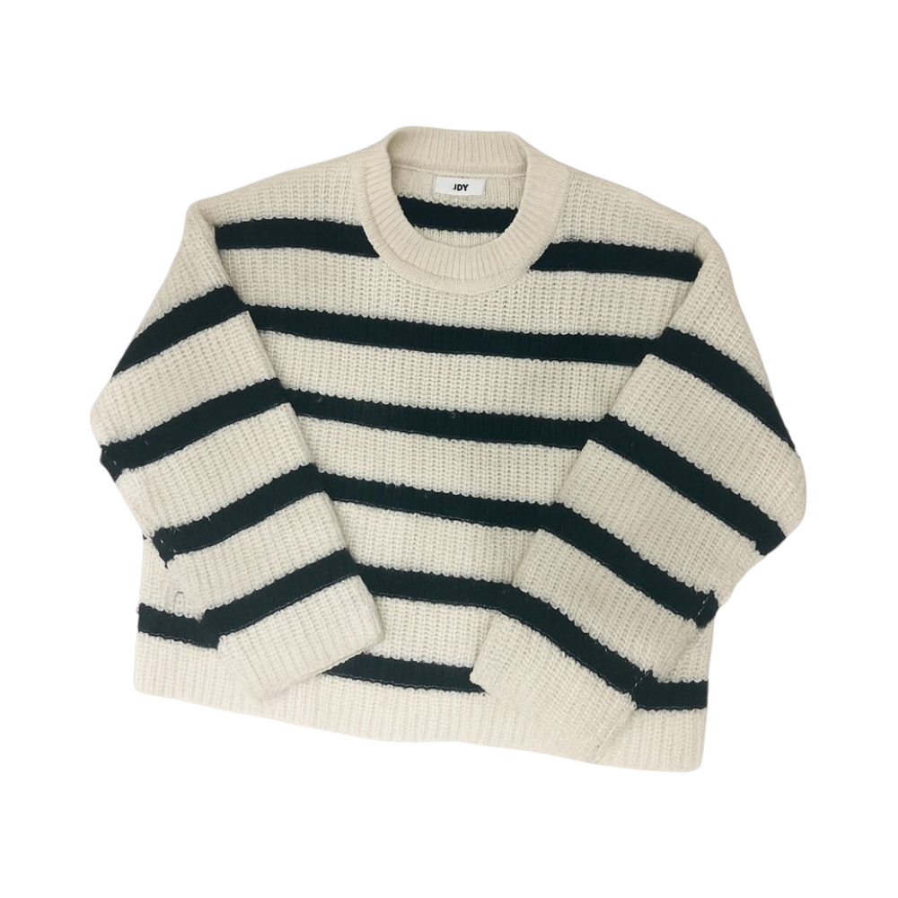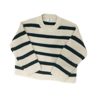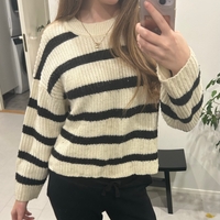 Beige-musta raitaneule, rento istuvuus, pyöreä pääntie. Ei tahroja mutta käytetty jonkinverran