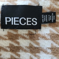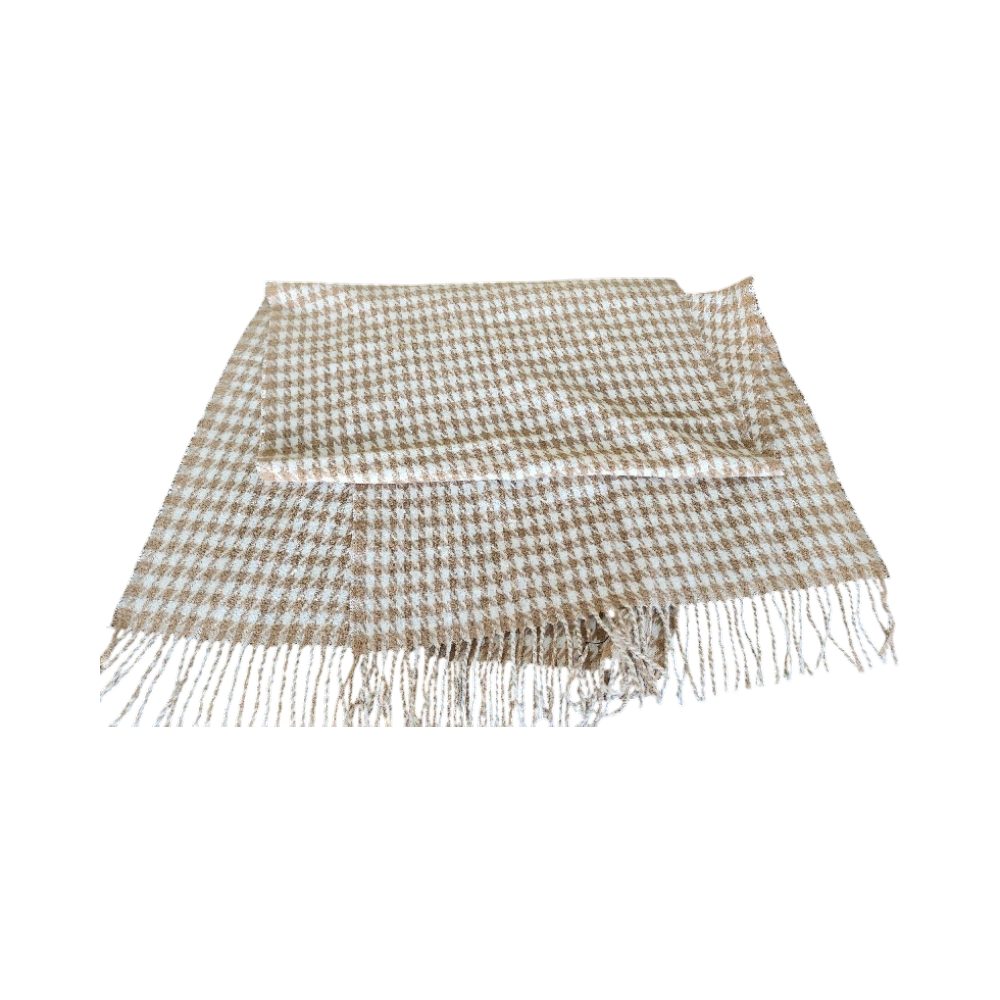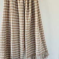 Beige-valkoinen ruudullinen, lämmin, pehmeä huivi, hapsureunat. Pituus 197 cm, leveys 64 cm. Kerran käytetty.