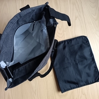 Tilava hoitolaukku. Ulkopuolella molemmin puolin tarrallinen tasku, sisällä kaksi taskua vetoketjulla sekä tuttipullotaskut. Mukana vaipanvaihtoalusta.