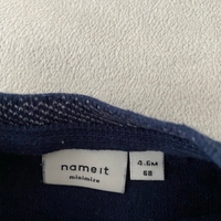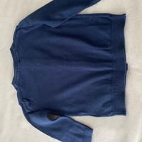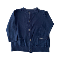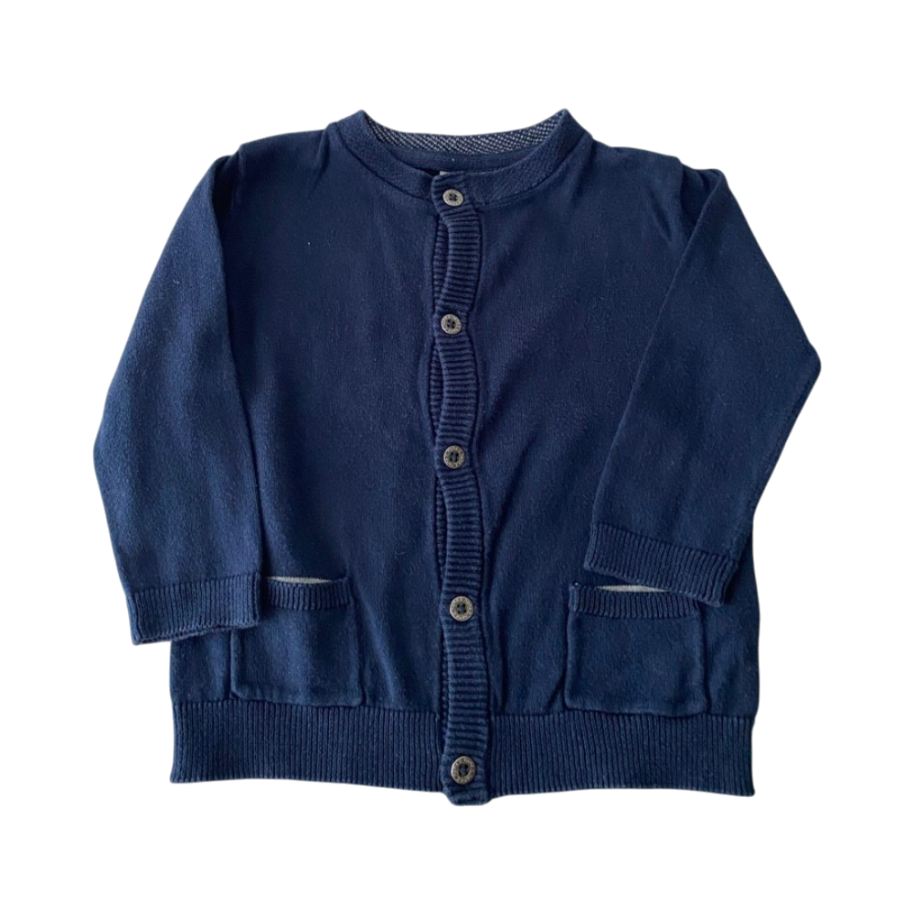 Sininen neulejakku vauvalla, napit edessä, pienet taskut.