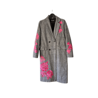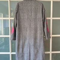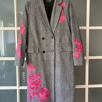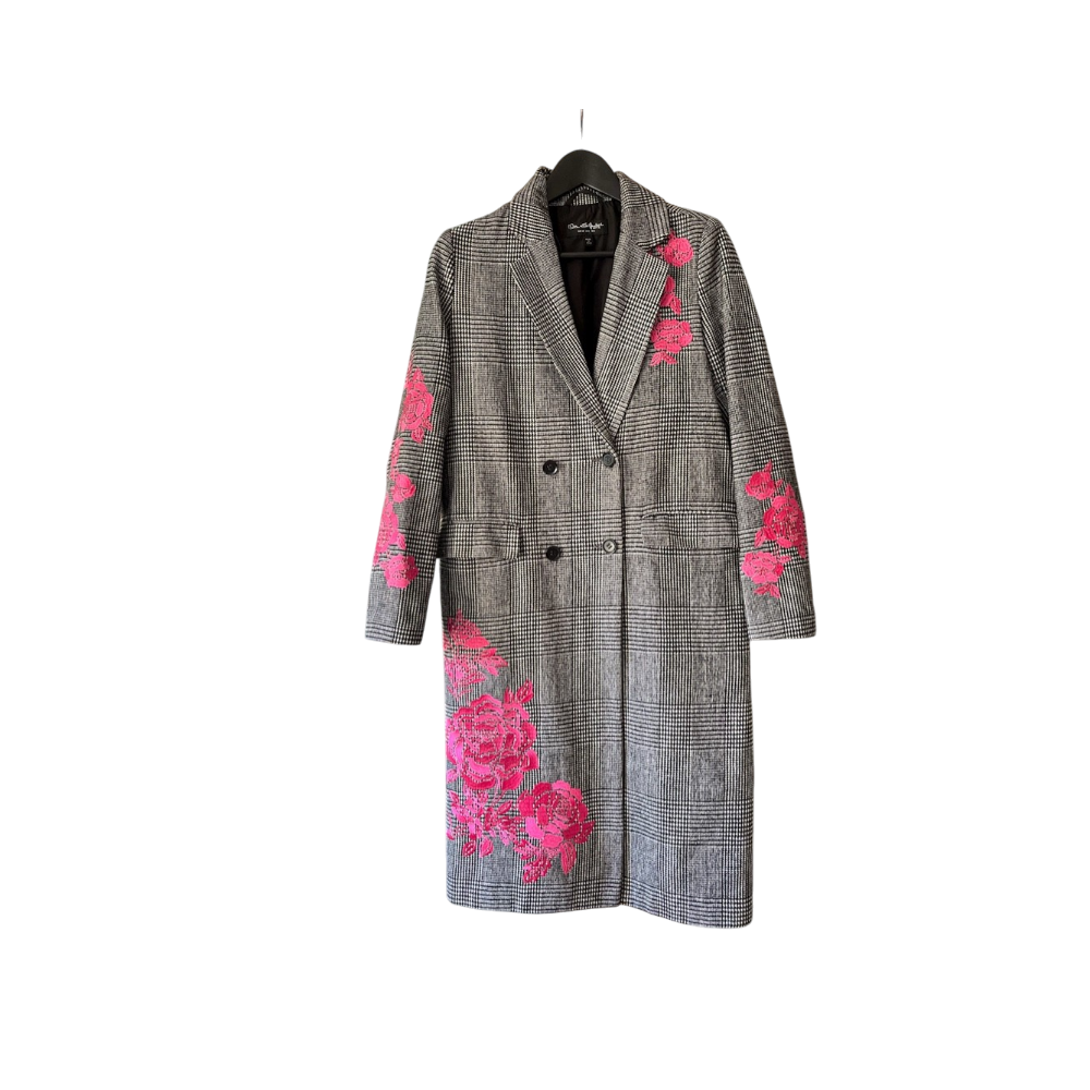 Pitkä ruutukuosinen villakangastakki pinkeillä kukka-aplikaatioilla.