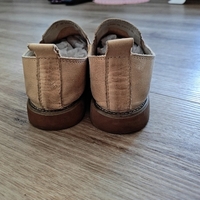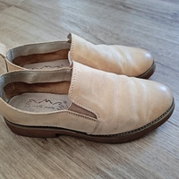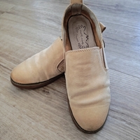 Comfortable beige slip-on shoes with brown sole, casual style.