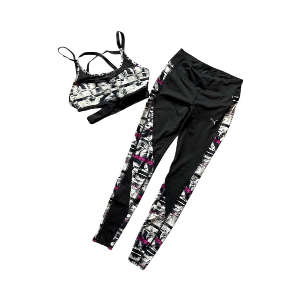 Setti treenitrikoot ja tukeva treeniliivi, kuviolliset reunat. Hyvät esim joogaan