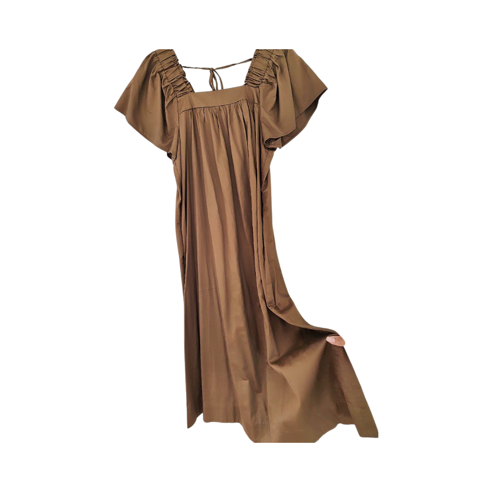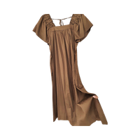 Ruskea midimekko röyhelöhihalla ja avonaisella selällä.