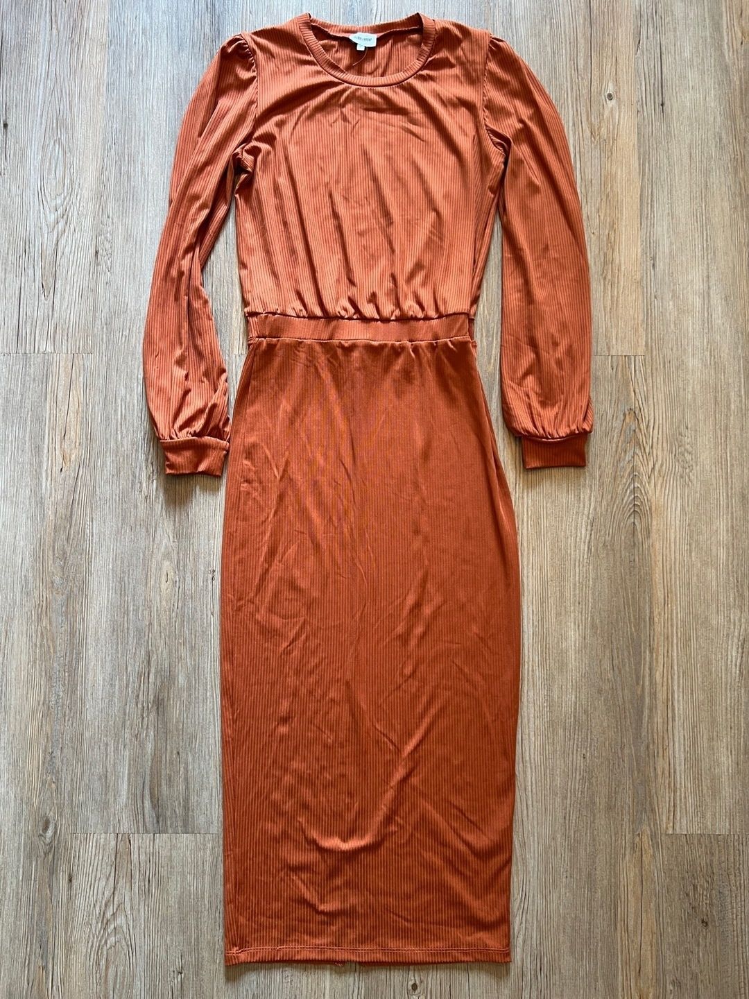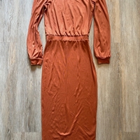 Ruosteen värinen tiukka ribattu trikoomekko. Takana keskellä halkio.