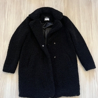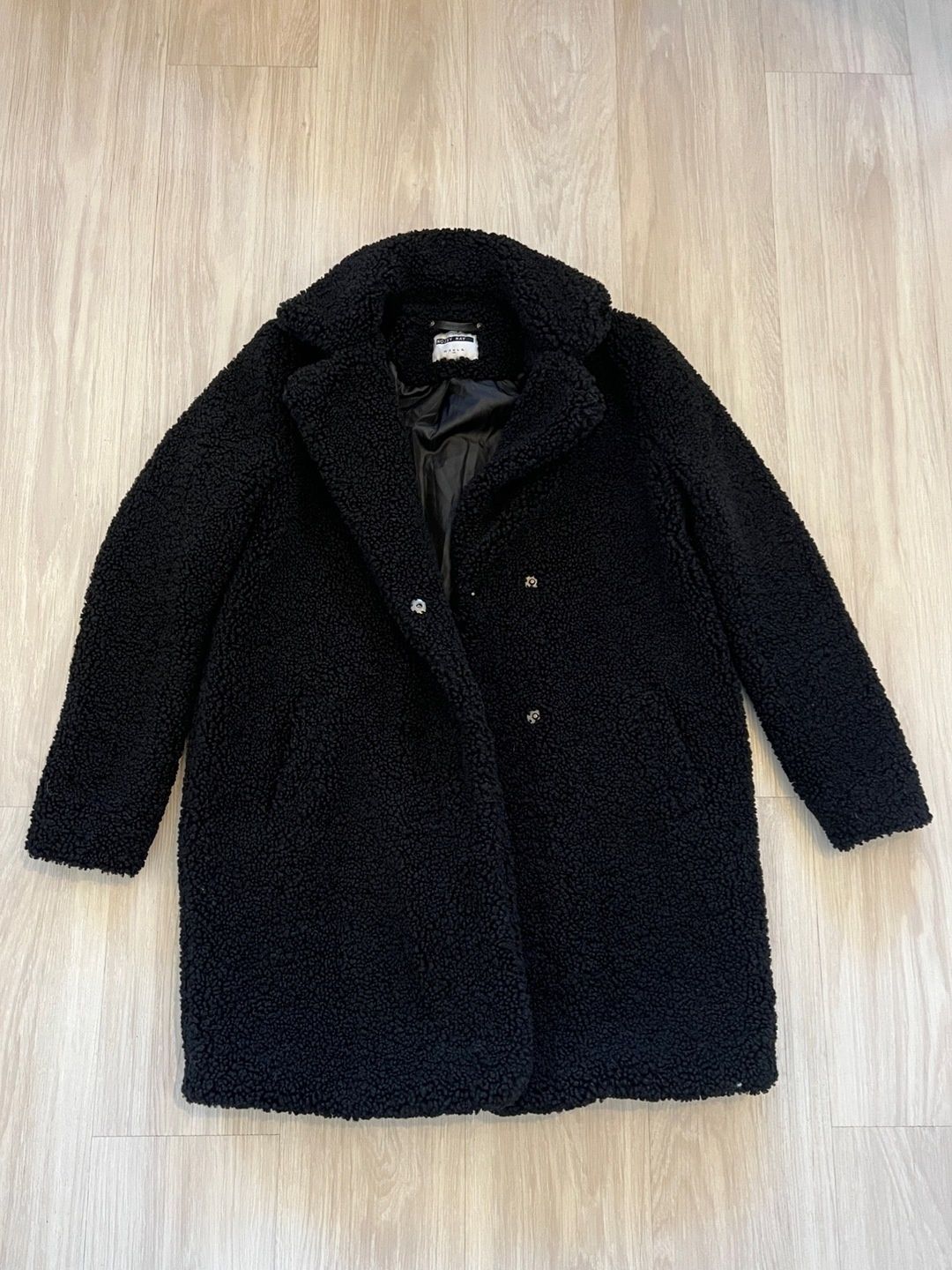 Musta teddytakki napeilla, hieman pidempi malli. Sivuilla taskut.