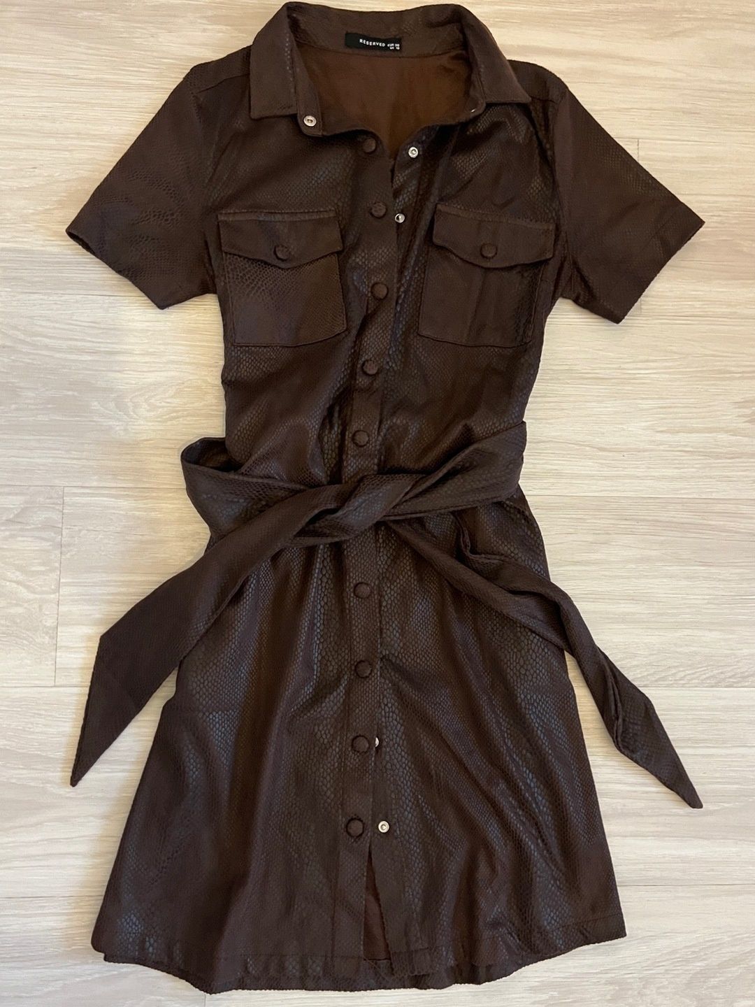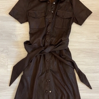 Ruskea t-paitamekko kauluksella. Edessä napitus ylhäältä alas, sivuilla ja edessä taskut. Vyötäröllä nauha.