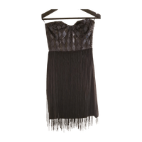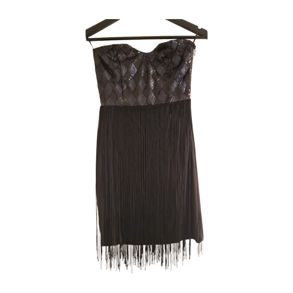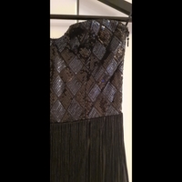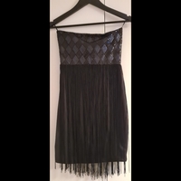 Kimalteleva minimekko joustavaa kangasta. Yläosassa näyttävä paljettikuviointi ja alaosassa hapsut. Vetoketju sivussa.