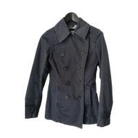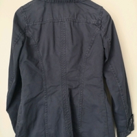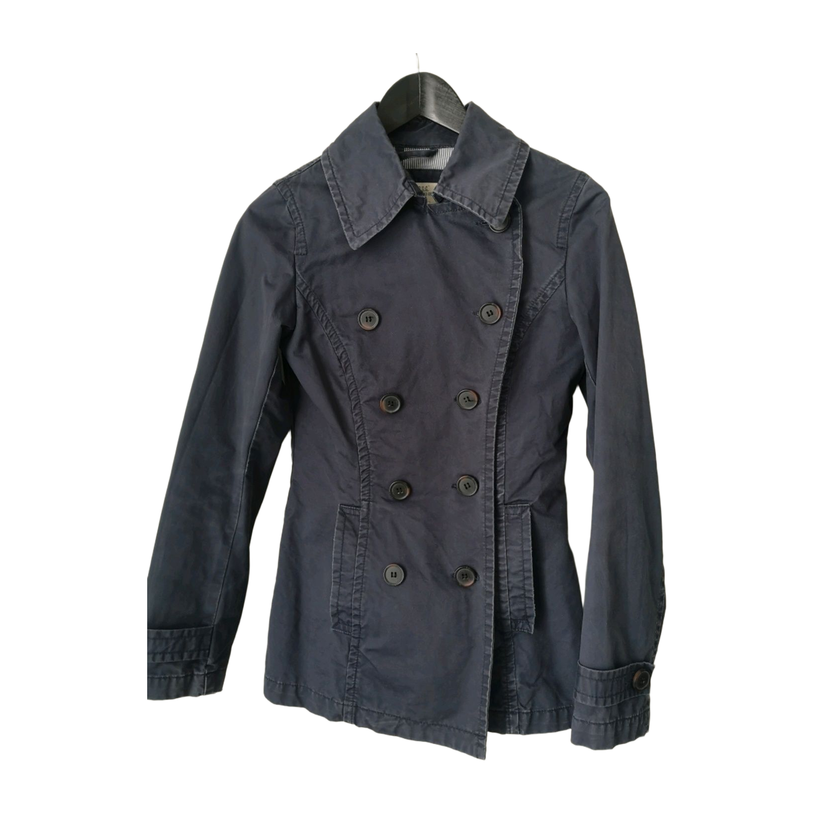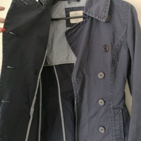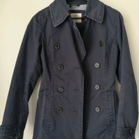 Tummansininen takki. Kevyesti muotoon ommeltu ja pituus about pepun yli. Noin 15 vuotta vanha mutta siistissä kunnossa, paitsi väri vähän haalistunut ja toisen taskun suuaukolta pari ommelta purkautunut. Kokomerkintä 34, sanoisin että lähempänä S kuin XS kokoa.