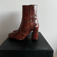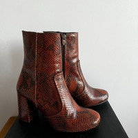 Todella upeat Kurt Geiger käärmeennahkakuvioidut nahkanilkkurit, koko 37, vastaavat kokoaan. Ajattoman tyylikäs malli, mallin nimi on Snape, Tan Comb Leather. Pyöreä kärki. Sisäsyrjässä vetoketju. Nilkkurit ovat olleet vain kerran jalassa, jolloin totesin niiden olevat liian korkeat itselleni. Kuin uudet. Ostettu Englannista, ostohinta oli 160 puntaa.