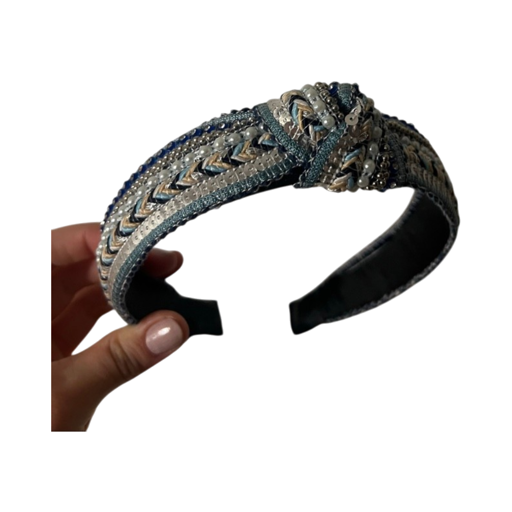 Koristeellinen hiuspanta helmillä ja paljeteilla.