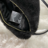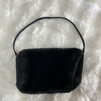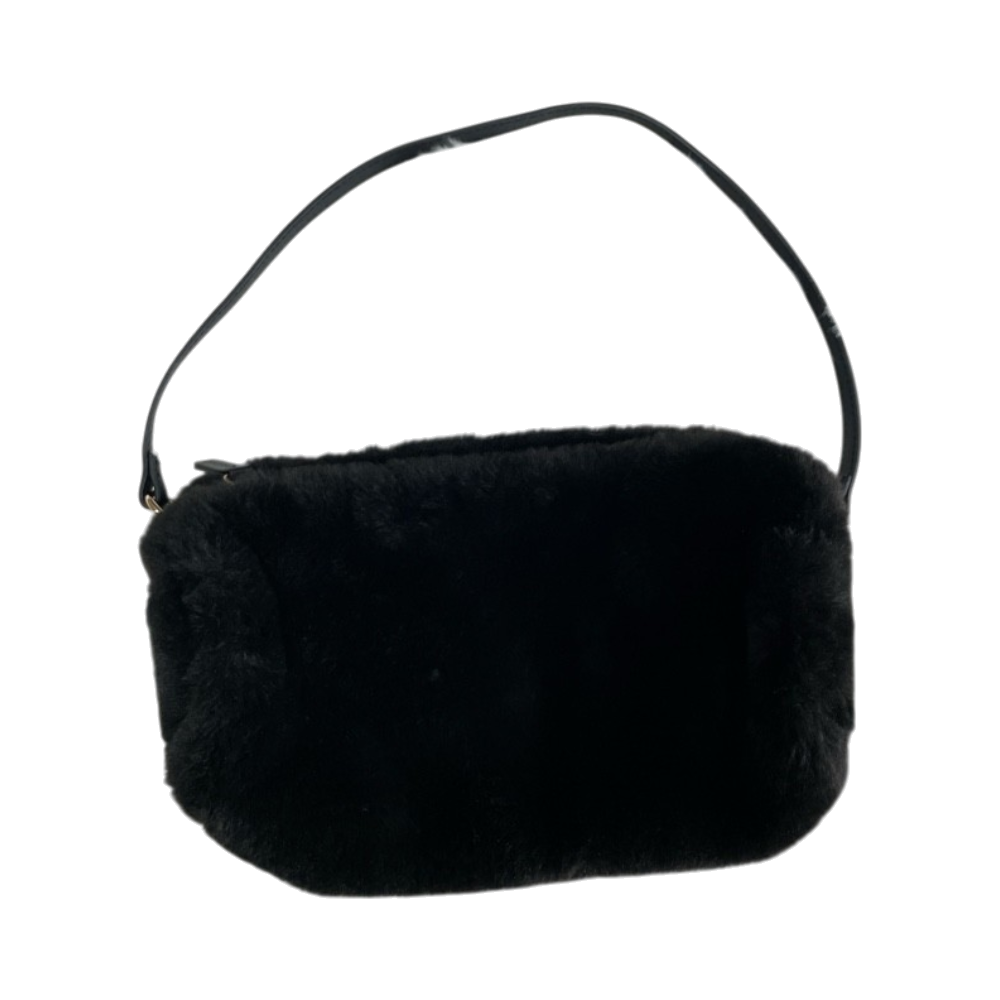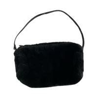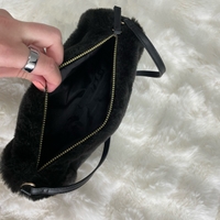Pieni musta tekoturkislaukku, vetoketjulla ja olkahihnalla.