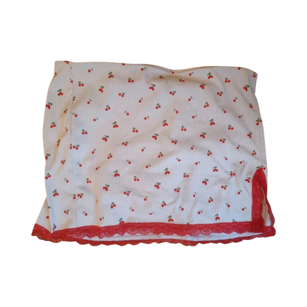 Valkoinen ribbihame kirsikkaprintillä ja punaisella pitsireunalla.