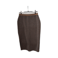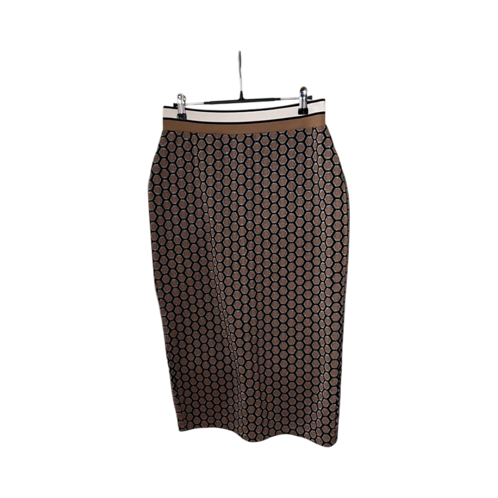 Brown midi skirt with black honeycomb pattern and striped waistband