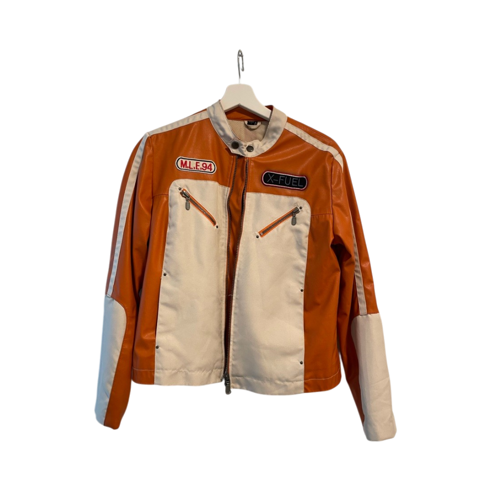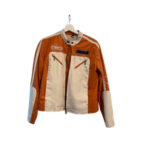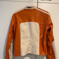 Oranssi-valkoinen ajotyyliin sopiva biker-takki, vetoketjullinen.