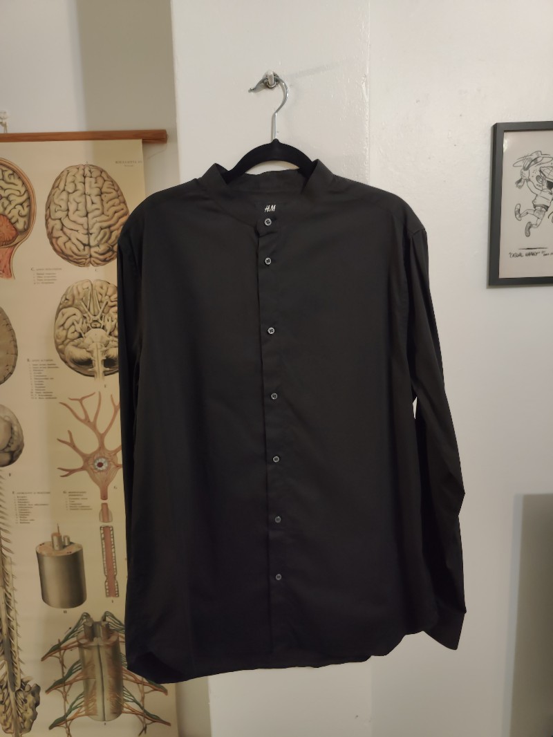 Pitkähihaine, napit edessä, siisti ja yksivärinen paita.