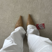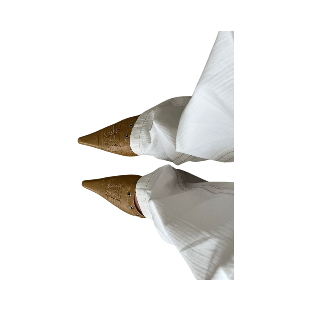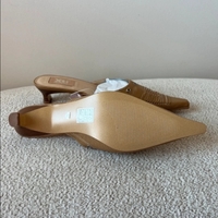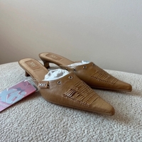 Pointed-toe slip-on mules with stitched detailing. Never worn, vintage.