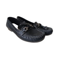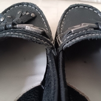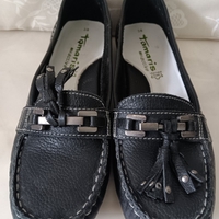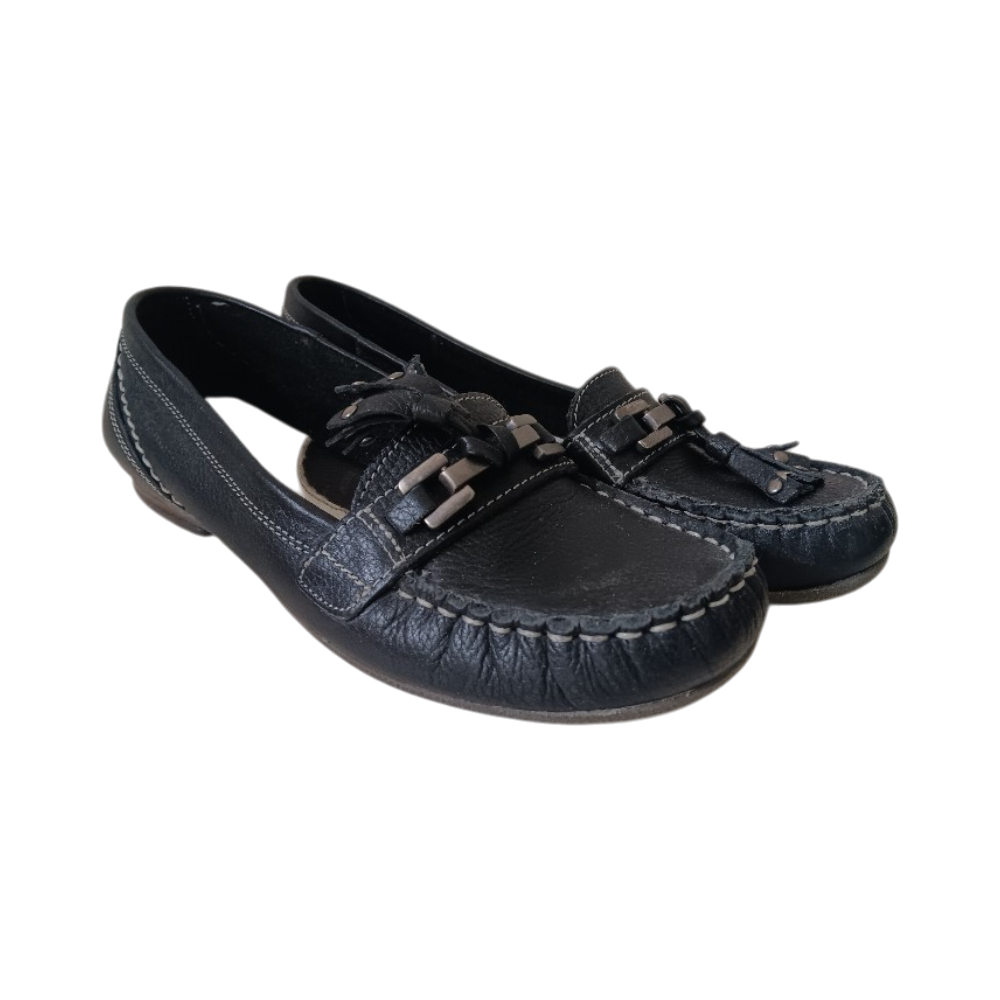 Naisten mustat nahkaloaferit tupsuilla, koko 38. Pari kertaa pidetyt. Tukevat jalassa, vahvaa nahkaa. Päällisin puolin virheetön. Pohjien korkolapuissa pientä kulumaa.