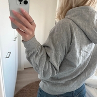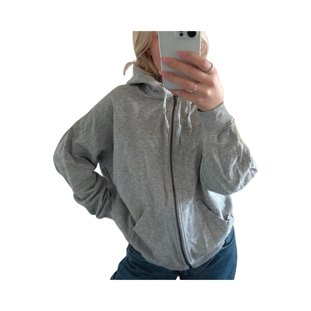 Lightweight grey zip-up hoodie with hood and front pockets.