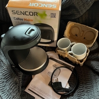 Laitetta on kokeiltu kerran, toimii moitteettomasti – käytännössä kuin uusi. Mukana kaksi valkoista posliinikuppia (ei käytetty).
