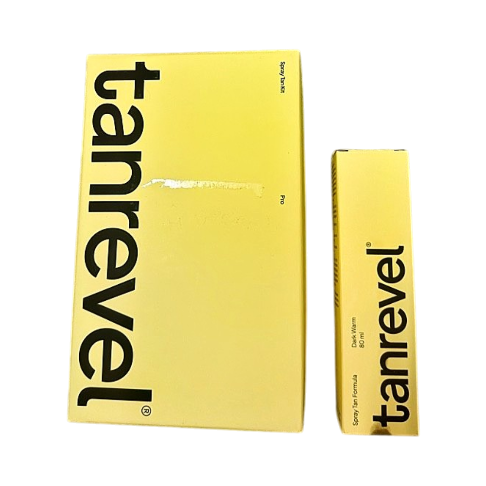 Avaamaton Tanrevel spray tan kit (sisältää laitteen, johdon ja itseruskettavan sävyssä dark cool) ja itseruskettava sävyssä dark warm. Ov hinta kitille 140€ ja itseruskettavalle 36€