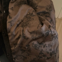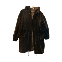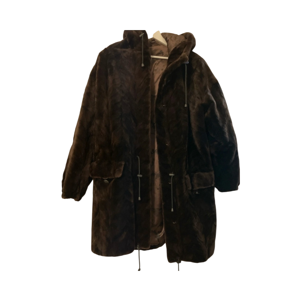 Lämmin polvipituinen keinoturkki, huppu ja säädettävät nyörit.