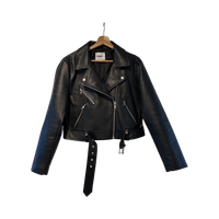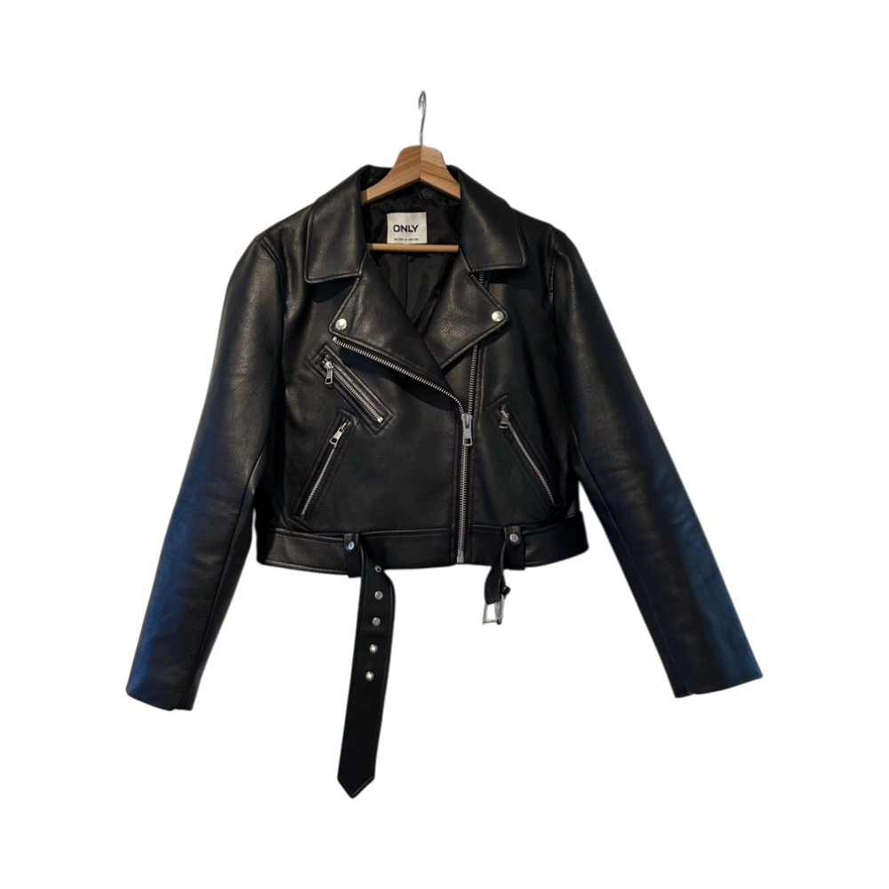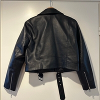 Lyhyt musta biker-takki vetoketjuilla ja vyöllä.