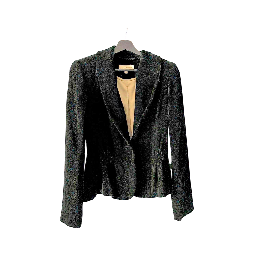 Laura Ashleyn sametti/plyyshijakku, kangas pehmeää ja laskeutuvaa, kaunis satiinivuori.