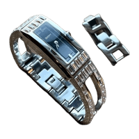 Siro rannekello, ollut vähällä käytöllä. Ruostumatonta terästä. Kellotaulun päädyissä ja rannekkeessa kauniit kristallikoristeet, musta kellotaulu. Paristo loppunut. Manuaali ei valitettavasti ole tallella. Rannekkeen ympärys ilman lisäosaa n. 18 cm. Ostettu Stockmannilta.