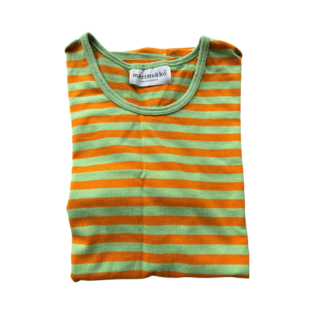 Vihreä‑oranssi raidallinen Marimekko‑t‑paita, hyväkuntoinen.