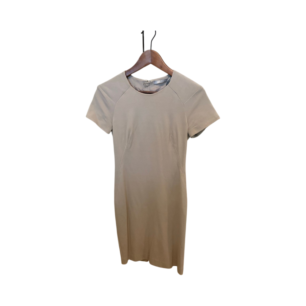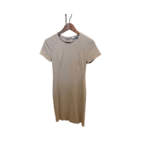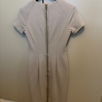 Siisti beige mekko, vetoketjulla takana, polvipituus.