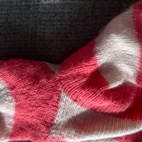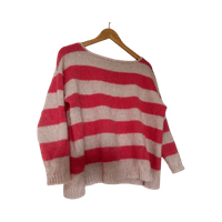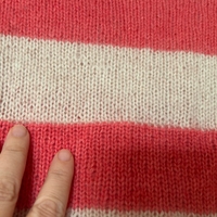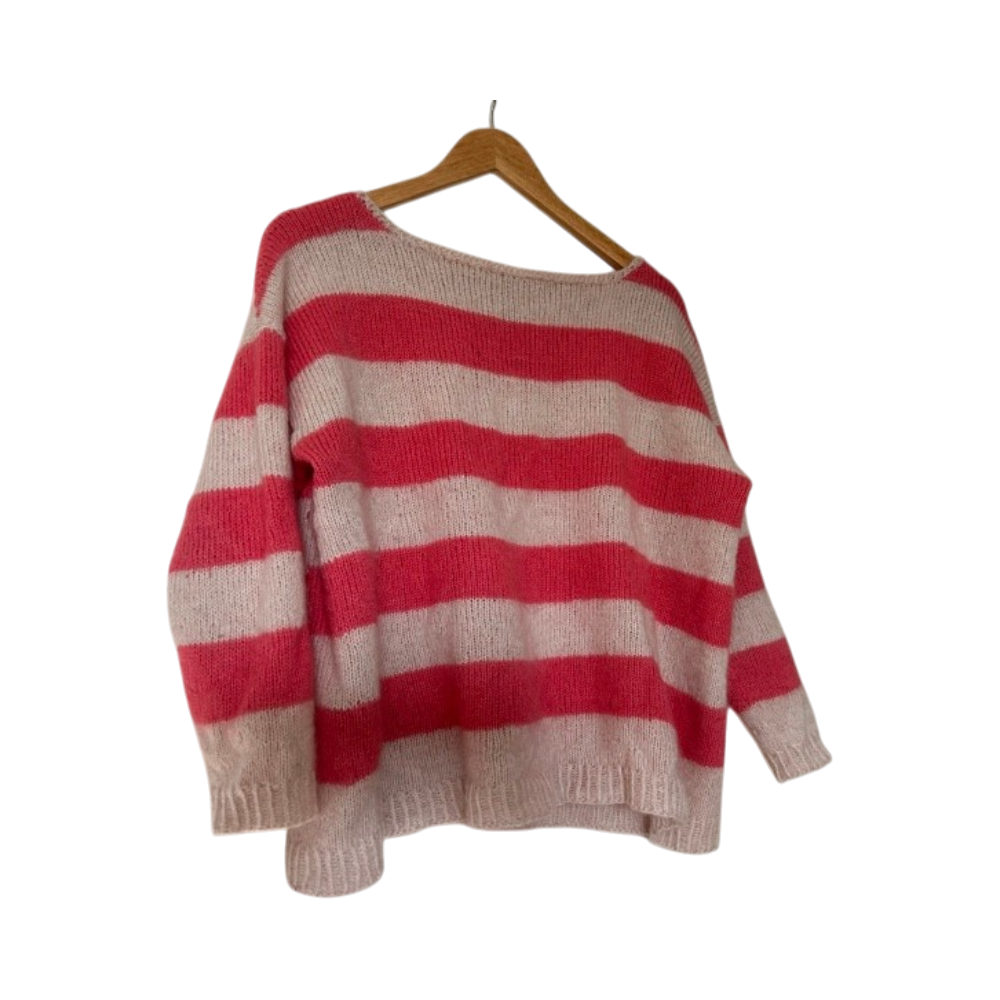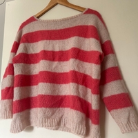 Itse neulottu, jonkin verran käytetty vaaleanpunainen raitapaita.