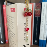 Itsetehty kultainen kirjanmerkki, koristeellisilla helmillä ja riipuksilla.