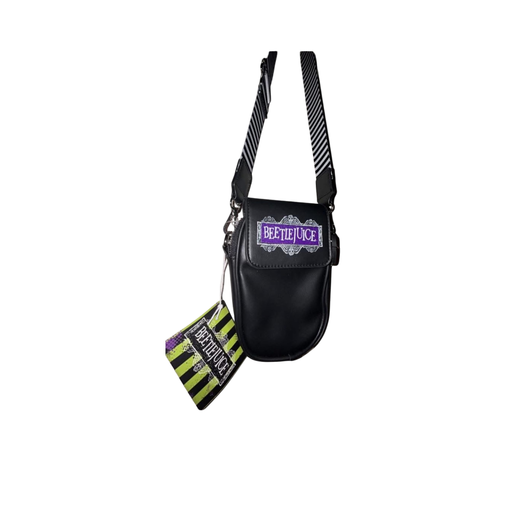 Pikkuinen musta Beetlejuice-olkakassi raidallisella remmillä.
