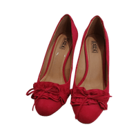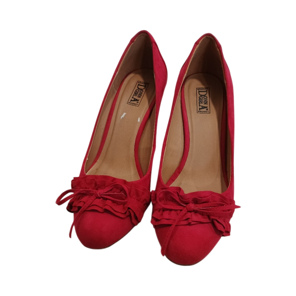 Red heeled pumps with ruffle and bow detail, gently used.