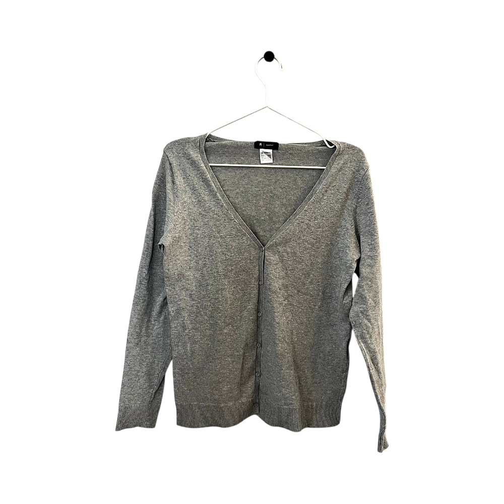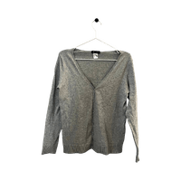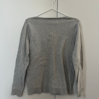 Harmaa neuletakki, koko 36/38. Kaksi pientä tahraa etupuolella.