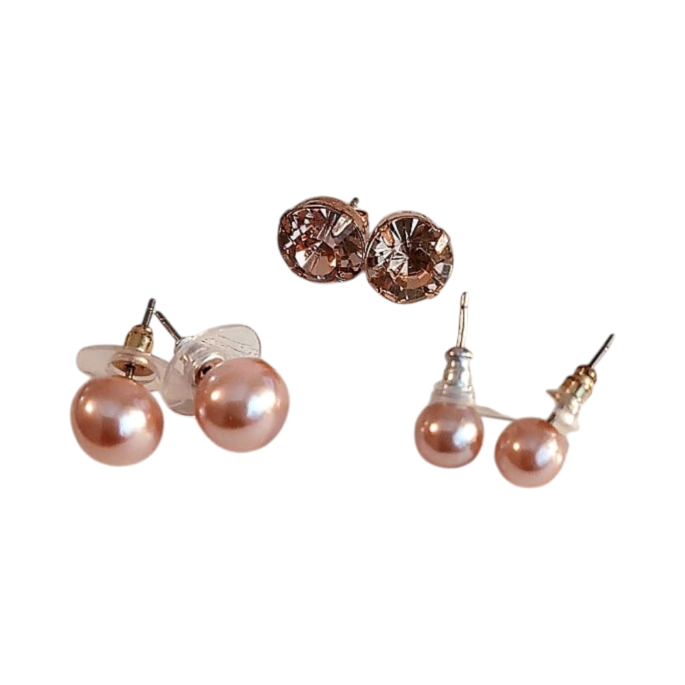 Set of three pairs of pink pearl and crystal stud earrings. 100% new