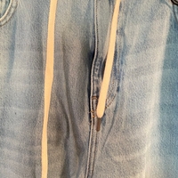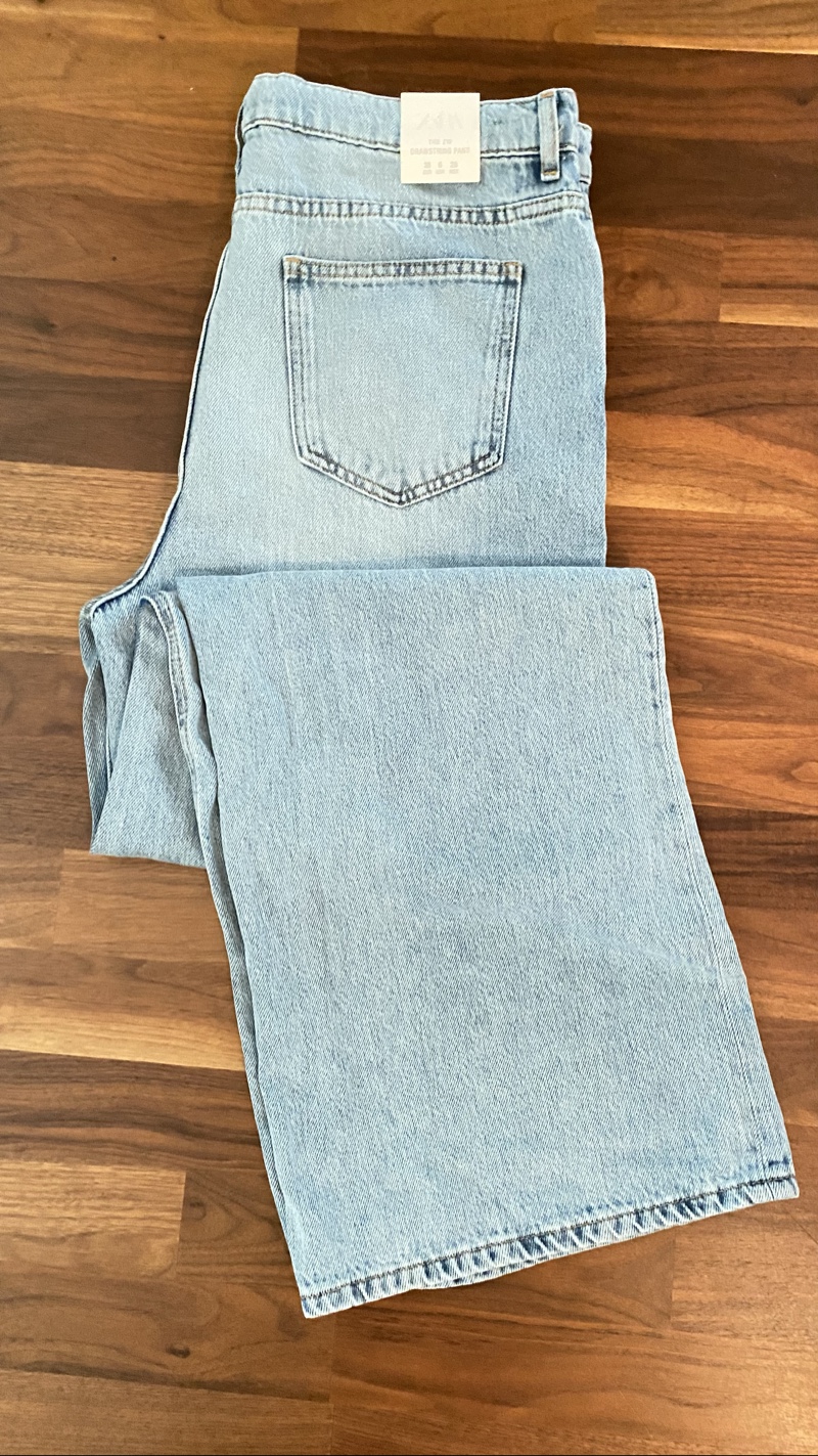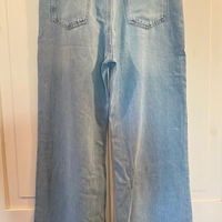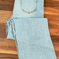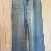 Vaaleansiniset, leveät lahkeet, korkeavyötäröiset farkut.