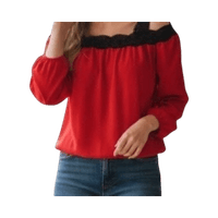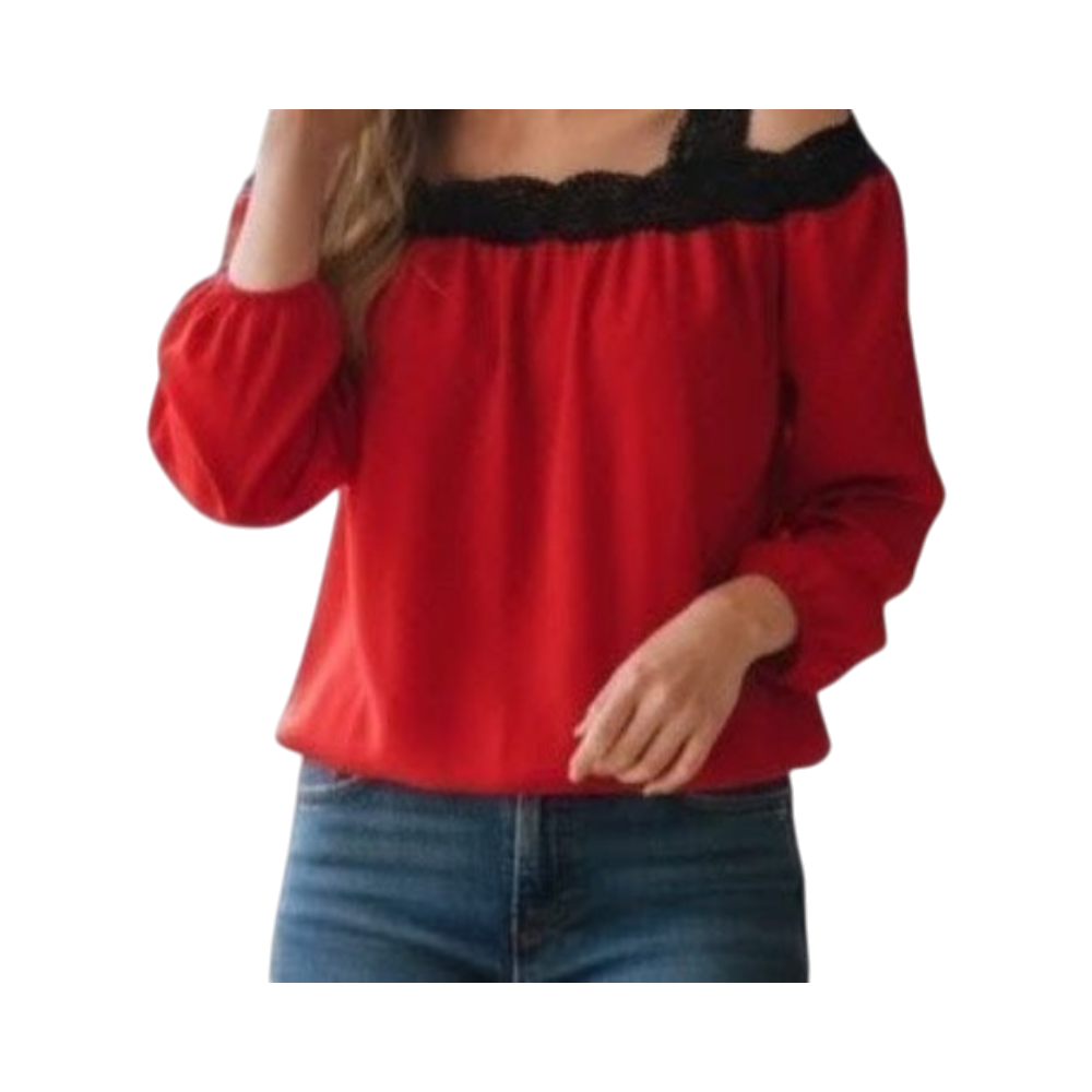 Pitkähihainen Off-shoulder pusero. Kuminauha hihansuissa ja helmassa. Pitsikoristeet yläosassa ja olkaimissa. Olkapäät paljastava.